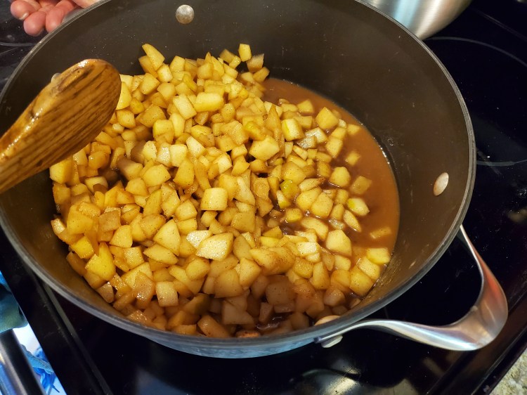 Drain the apples and add them to the butter. Stir the apples until they are coated with the browned butter. Once coated, add the sugar and cinnamon. If you like a strong cinnamon flavor, don’t be afraid to add an extra teaspoon of cinnamon. Stir frequently until the apples start to soften. I think that, ideally, this means the outside of the apple bit is soft, but still a little crisp in the middle. Sampling an apple bit is the only way to check, just don’t burn yourself.