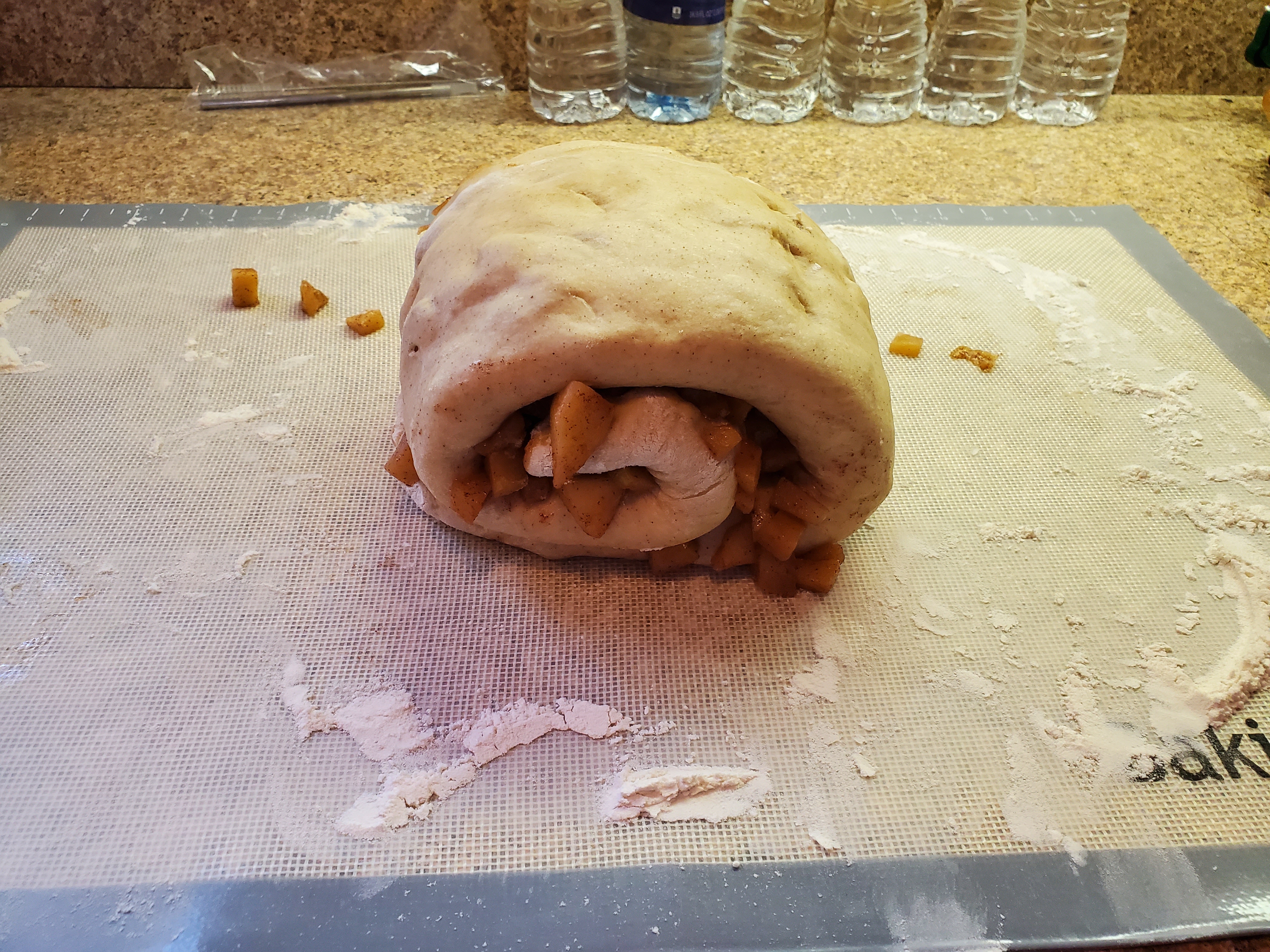 Take the dough and roll it along the longest edge. Once it is rolled up, flatten the roll with your hand and add the remaining apples across the top of the dough. Once the apples are added, roll the dough along the short edge. You should end up with a roll of a roll. If apples fall out, and they will, just push them back into the dough.