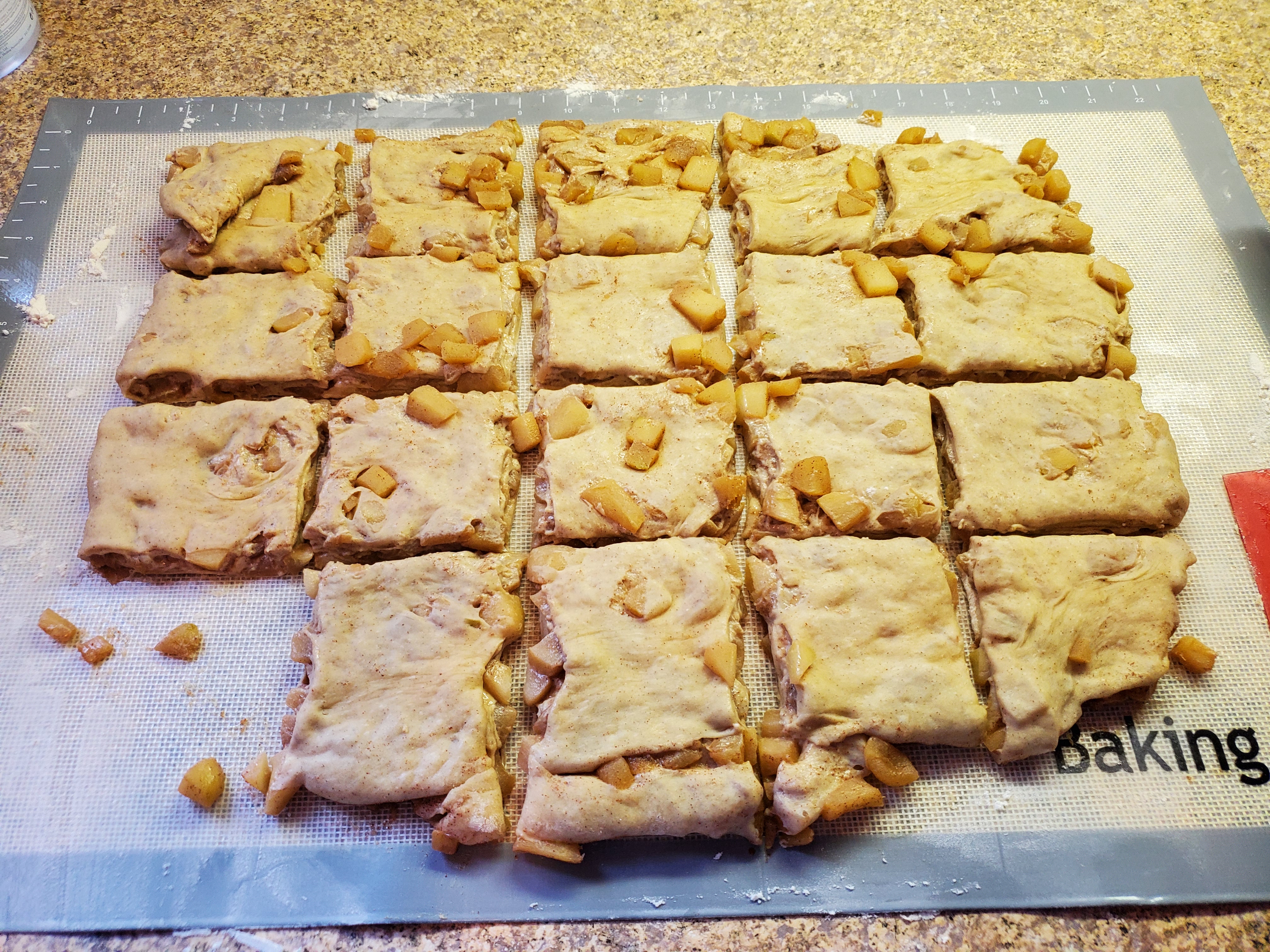 This next part was a little messy because the dough became moist and sticky because of the liquid from the apple mixture. Just wanted to point out that this is ok. Take your ball of dough and apples and roll out into a rectangle between ½ – ¾ inches thick. Do not roll out the dough too thin, otherwise it may become too hard to work with. Once you have the dough rolled out, cut the dough into squares between 2 and 3 inches wide.