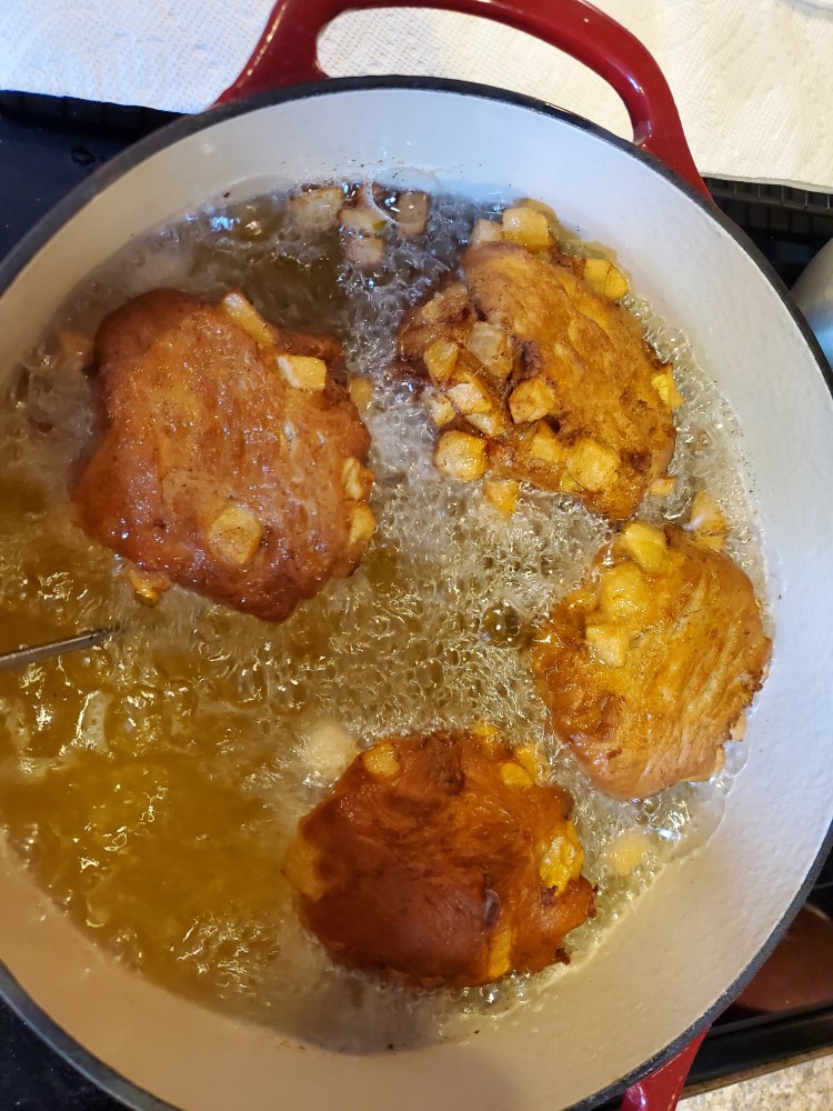 Note, apple bits will fall out of the fritters. That’s ok. Let the apples cook with the fritters and remove them after the fritters have finished cooking. The cooled fried apple bits are very delicious by themselves.