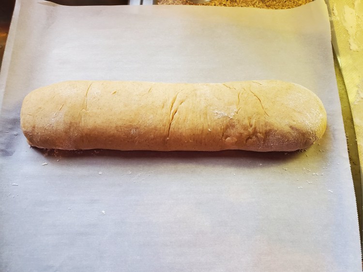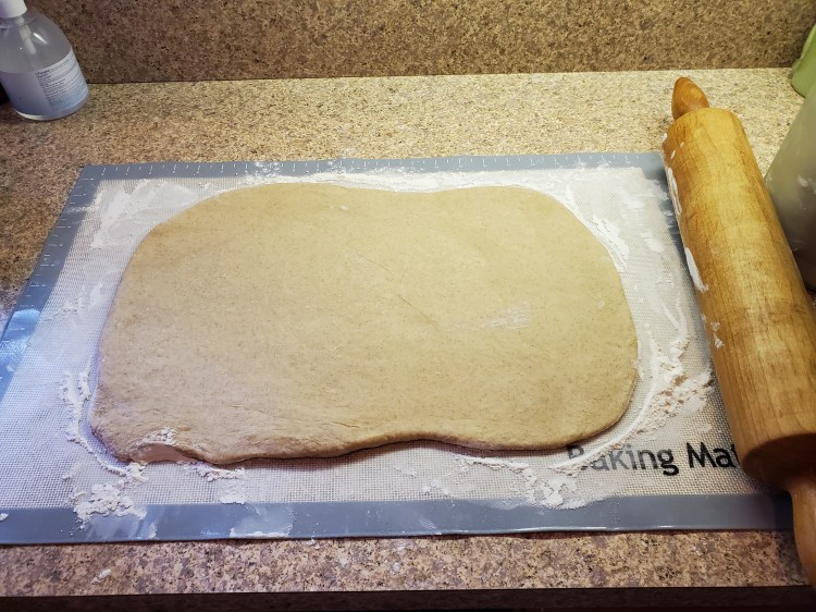 When your dough has doubled in size, roughly an hour, dump the dough out onto a lightly floured surface. Using a rolling pin, roll the dough out to a thickness of about ½ inch. When I did this the rectangle was about 15 inches by 10 inches. Don’t roll the dough out too thin.
