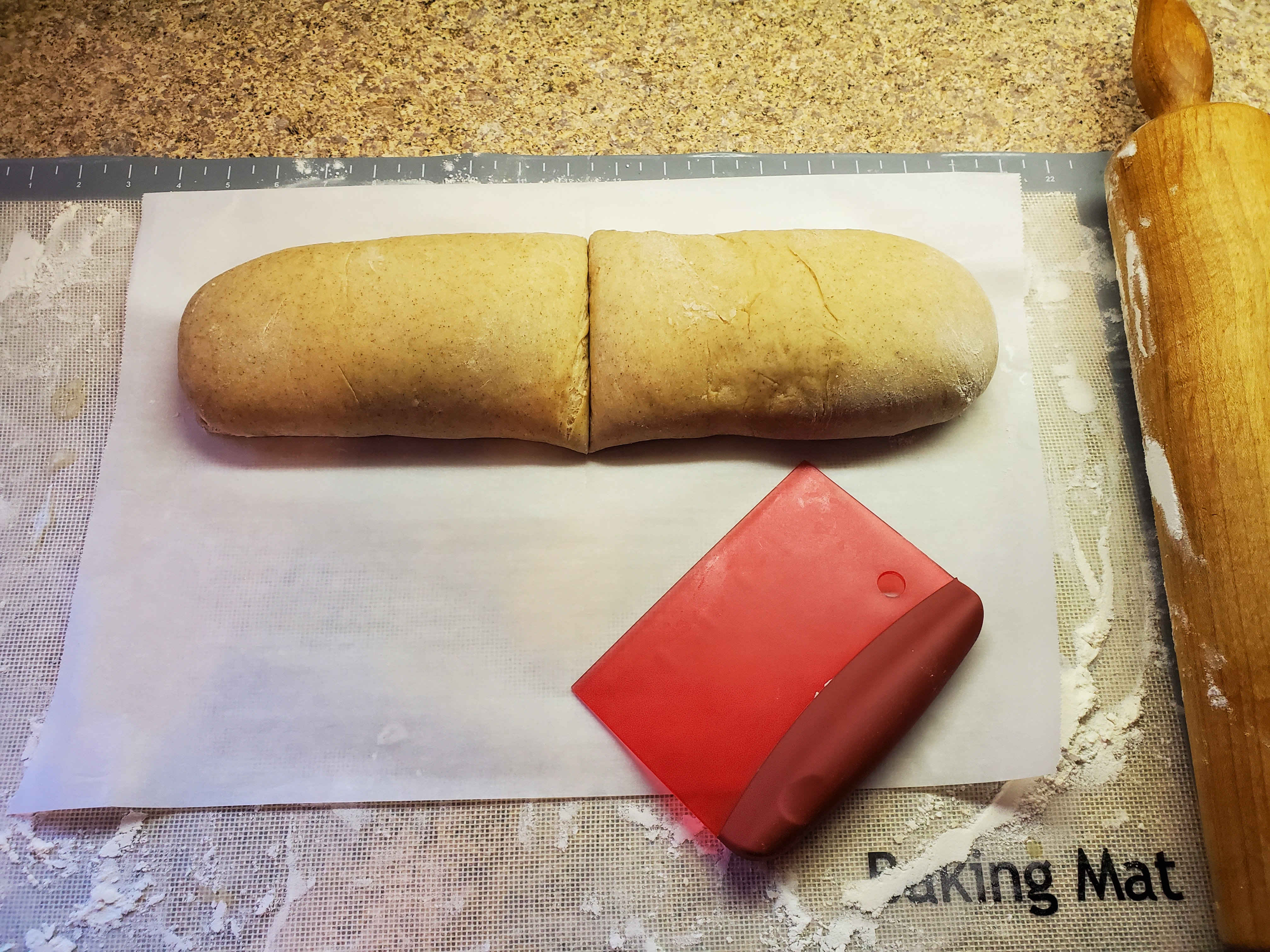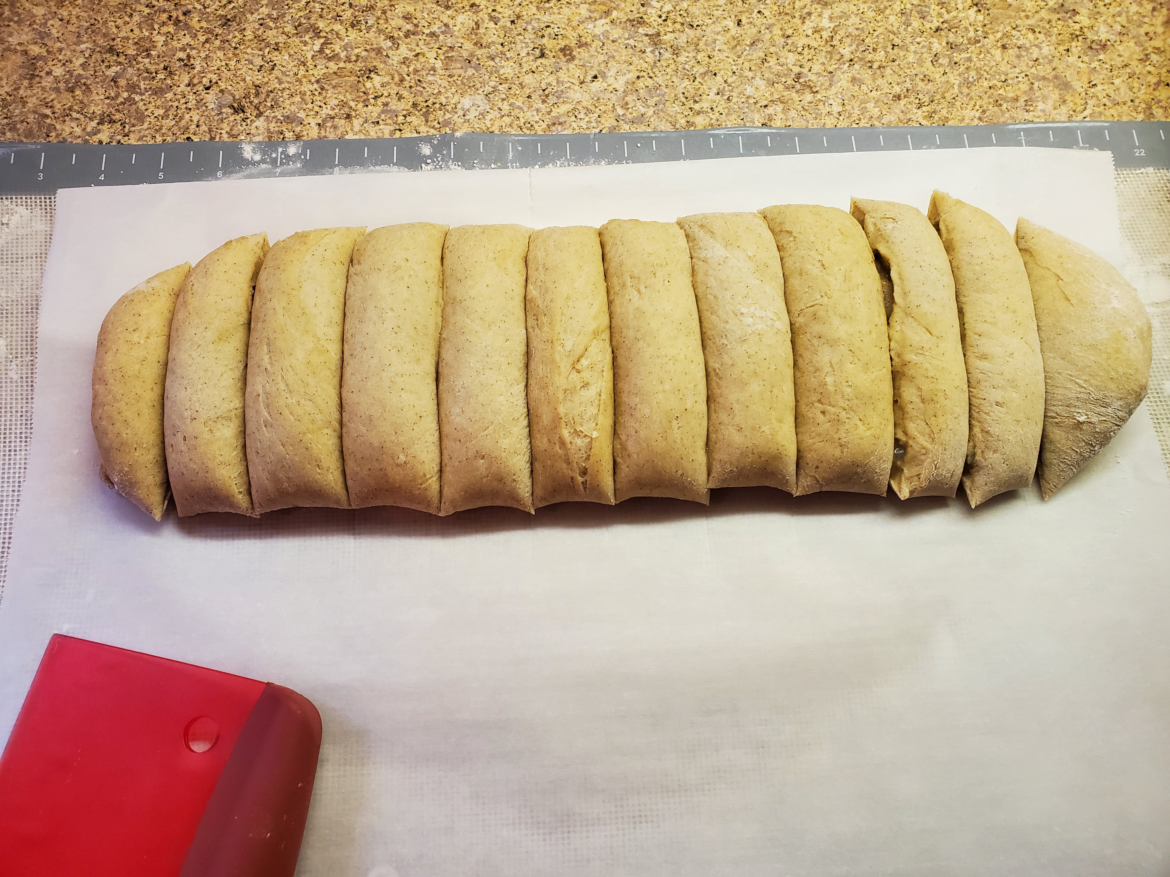 After your log has been refrigerated for about 30 minutes, it’s time to cut. Place the log onto a surface that you can cut on. I used a kitchen scraper to cut individual rolls, but in the past, I have used a serrated knife with a sawing motion to cut rolls. This recipe should make 12 rolls, so I cut the log in half, then I cut the halves in half, making quarters. This is a pretty easy way to keep things pretty even. Each of the quarters is then cut into three equal parts.