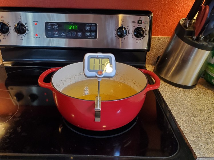 While the rolls are raising, you should start to heat your oil. If you don’t have a fryer, I recommend using a heavy pot on your stove at a medium-high heat. I am using a dutch oven, which is cast iron coated in enamel. The cast iron helps maintain a consistent temperature but takes a while to heat up (about 30 – 40 minutes). I use a digital thermometer to monitor the oil temperature, trying to make sure the oil doesn’t get over 375 degrees. Don’t let the thermometer touch the bottom of the pan, but make sure it’s in the oil.
