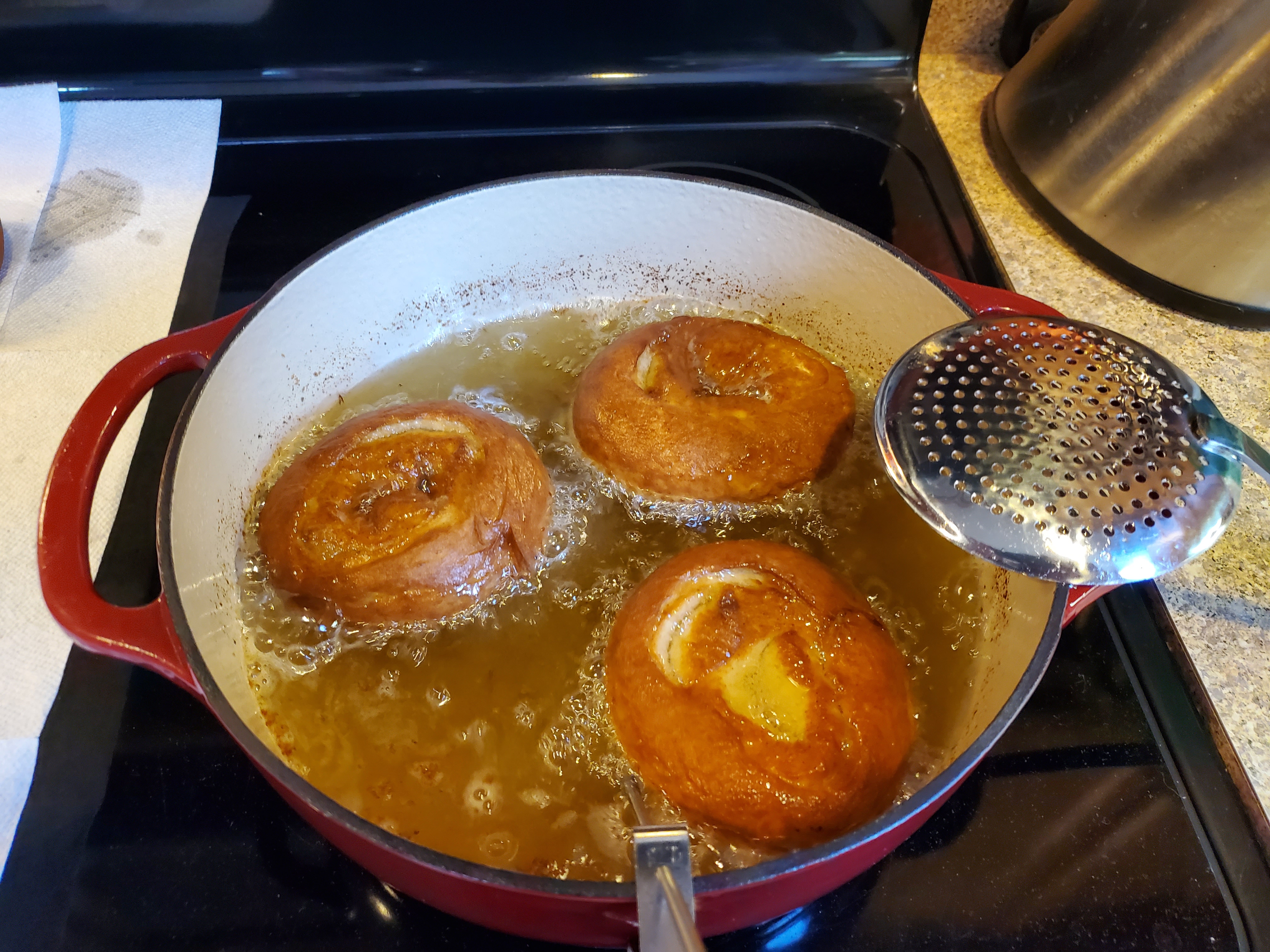 When the oil is at least 365 degrees Fahrenheit and the rolls have raised for 30 minutes, it’s time to cook. Gently lift the rolls off of the baking sheet and lower them into the oil. Don’t drop them in the oil and make a splash, you don’t want to get burned. You want to cook them 3 at a time. Any more than 3 may cool the oil too much or make your pot too crowded. Cook them for about 2 minutes, or until golden brown, then flip them. After flipping, cook for another 2 minutes, or until the side is golden brown. Using a slotted spoon, remove the roll and place on a paper towel covered cooling rack. Wait for the Oil to get back to at least 365 degrees before cooking the next batch.