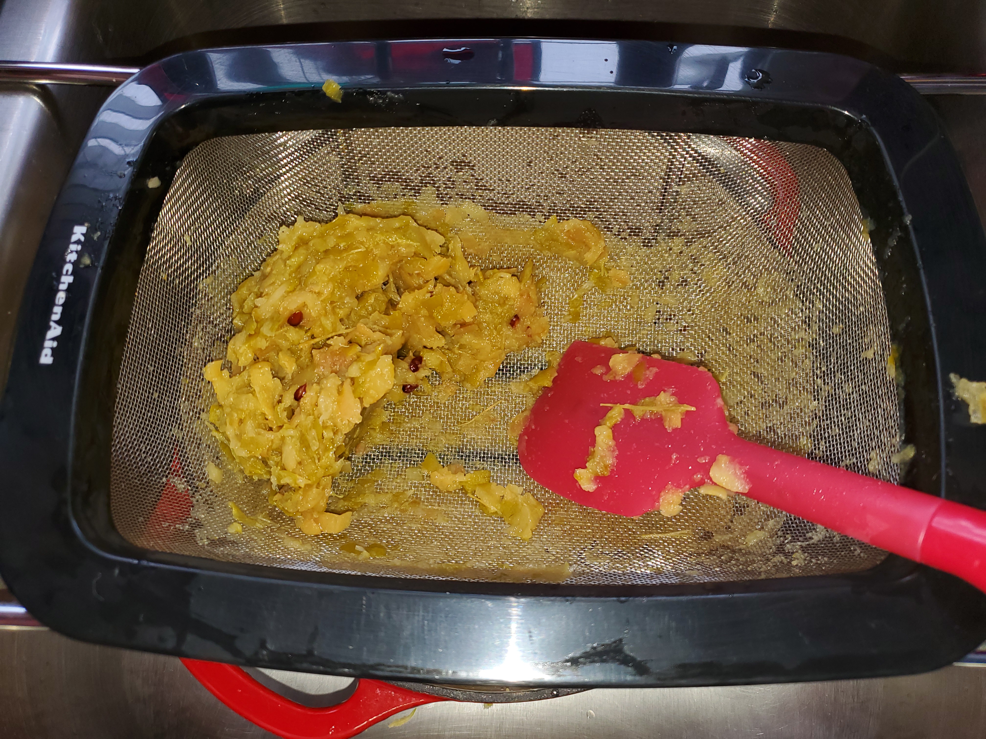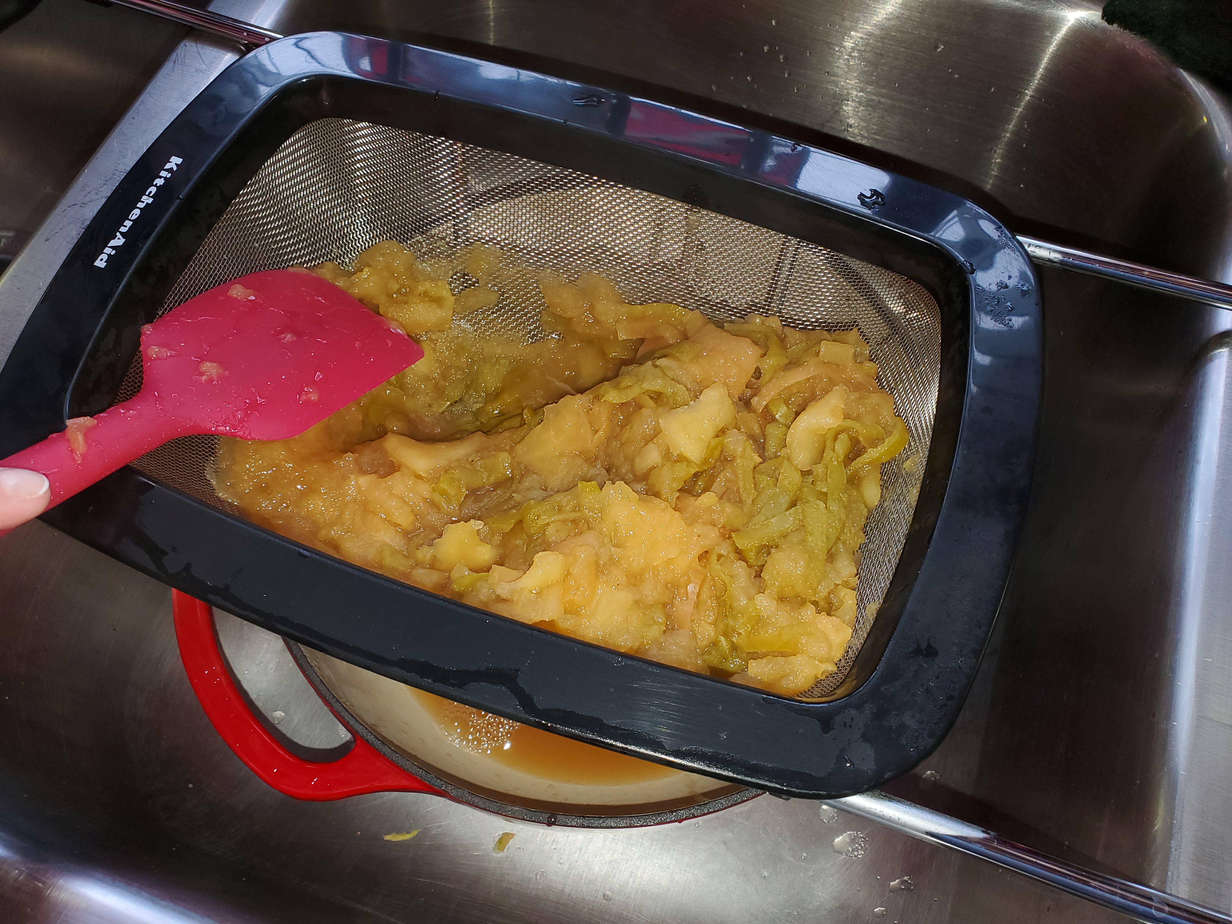 Now comes the fun part, and where we made our major mistake. Drain the fluids into a separate container, leaving behind just the apple flesh, cores and peels. Now, put the apple flesh, core and peels into a medium mesh sieve or a food mill. Use a small portion of the apples, which makes it easier to work. If you put too much into the sieve, it is difficult to force apple flesh through the sieve. Now, take a silicon spatula (or rubber) and push the apple flesh through the sieve into a pot. I found that holding the spatula at a 30 – 45-degree angle and pulling the flesh across the mesh. This will gradually push the fruit into the pot. You will end up with peels, core husk, and seeds in the sieve. The first picture shows apples before being pushed through the sieve. The second picture shows the left overs after most of the apple flesh has been pushed through. The third picture shows the apple after it was pushed through the sieve. This is where we made a critical mistake by not straining off the fluids first. Be sure to strain off the fluids.