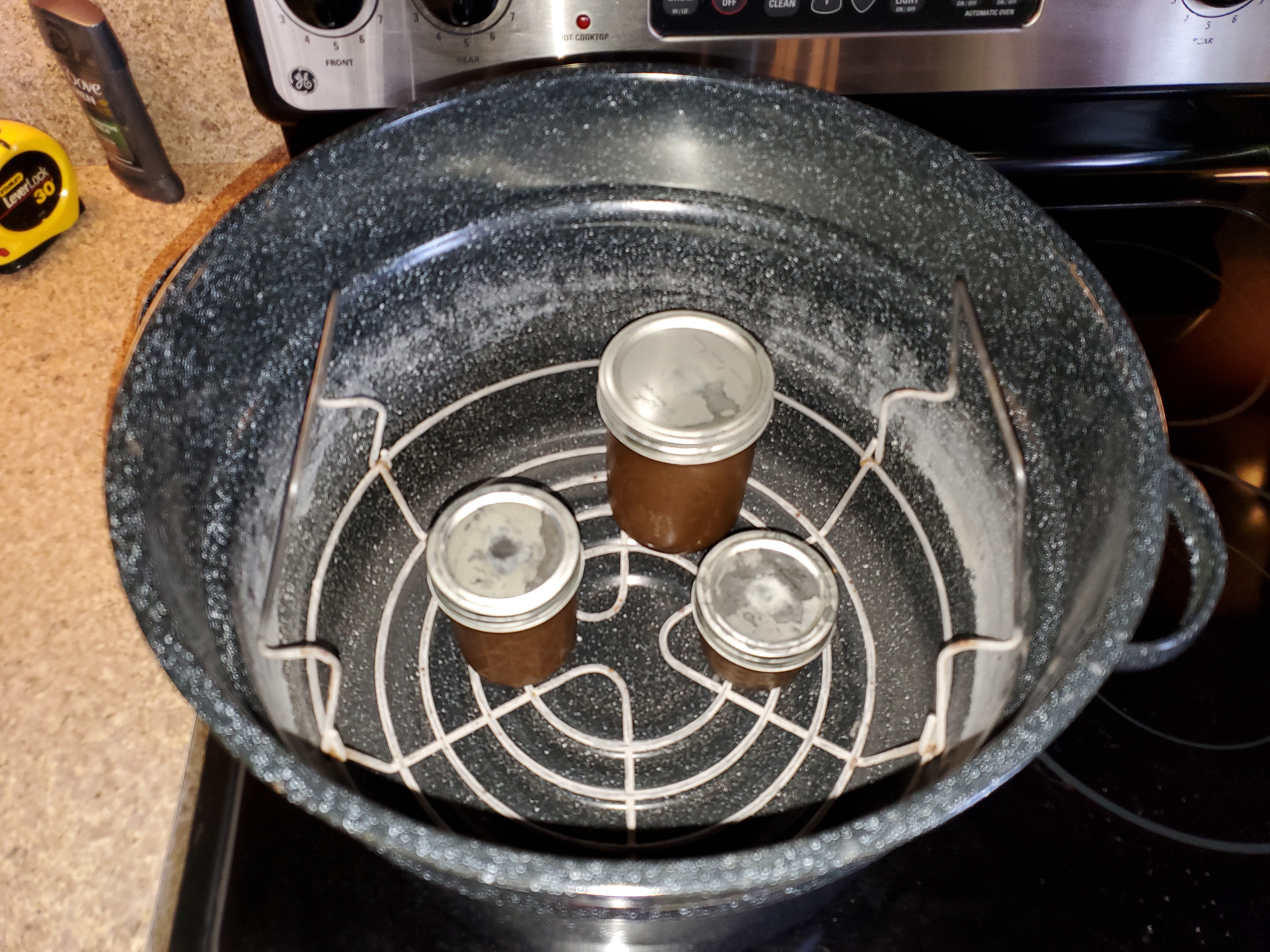 Fill a large pot with enough water to completely cover your largest jar. If you have a canning rack, use it. If you have a steamer rack, use it. You need to make sure the jars are not touching the bottom of the pot. Bring the pot to a complete boil and lower the jars into the boiling water. Boil the jars for 5 minutes, remove and let cool. As the jar is cooling, the top should pop. This means the raised middle of the jar lid should be down, and no longer makes a click sound when pressed. Picture 1 is a canning pot with a canning rack. Picture 2 shows a finished jar. Please note the indentation on the lid and how it appears depressed.