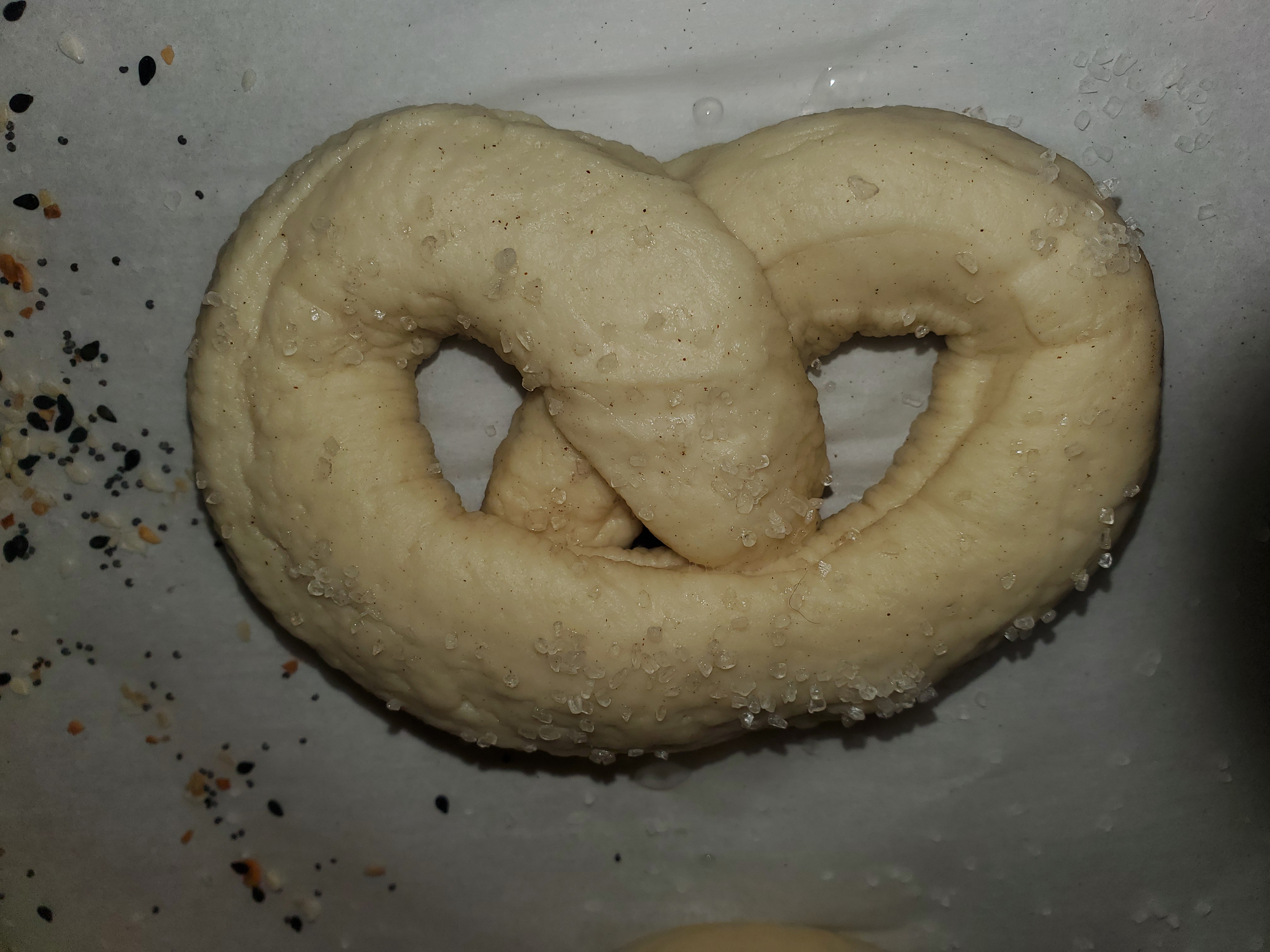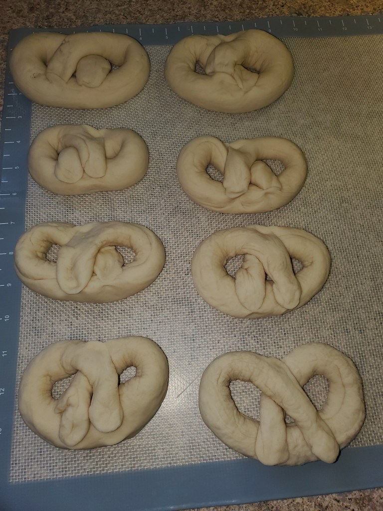 - Cut dough into 12 equal parts and form into pretzel shapes