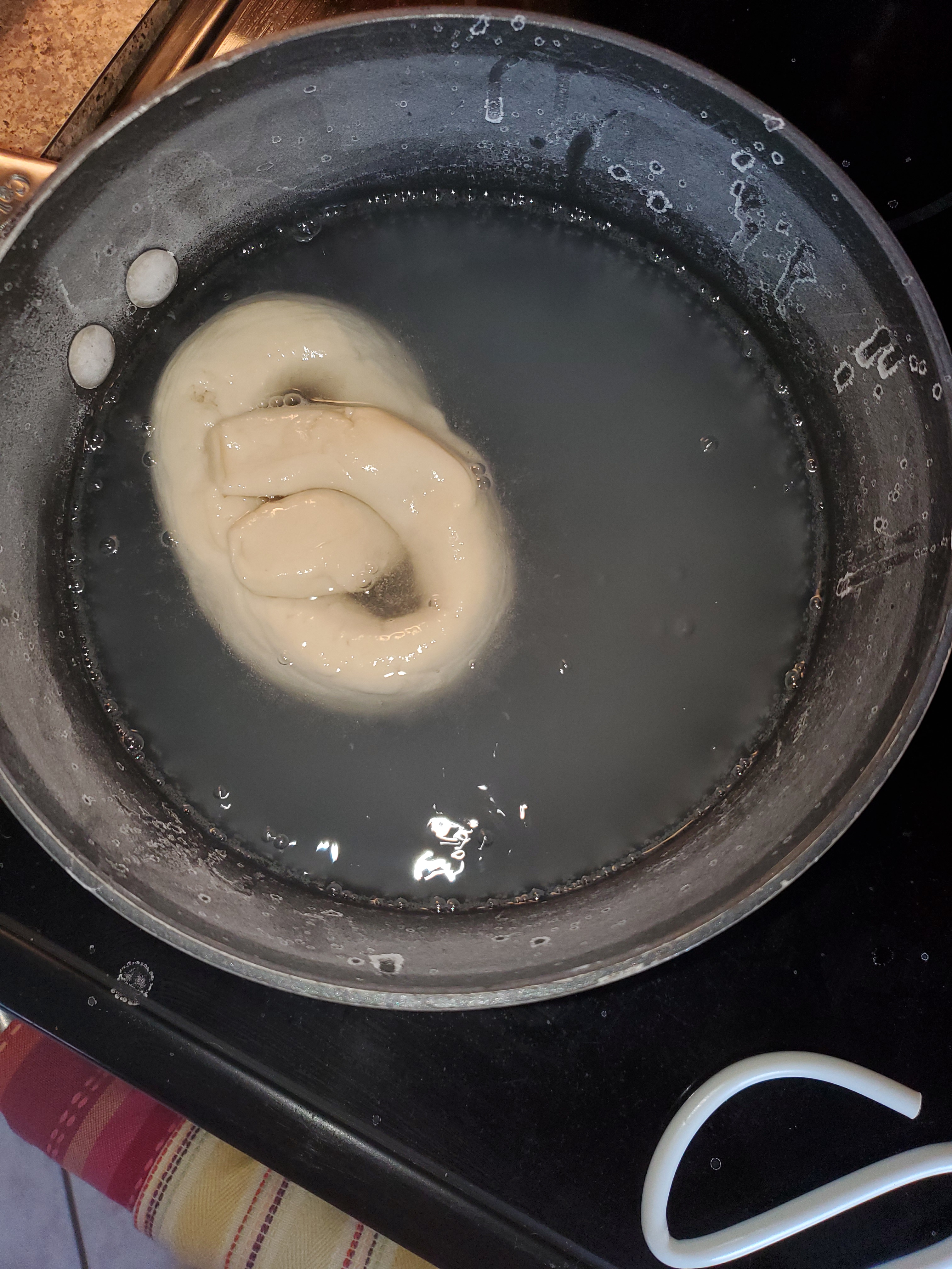Toward the end of the hour, set your oven to 450 degrees Fahrenheit. Cover 2 baking sheets with Parchment Paper. Take a 4-quart cooking pot, fill with 4 – 6 cups of water. Add the baking soda and stir until dissolved. Heat the water to a boil, then turn the heat down until the water is no longer boiling.