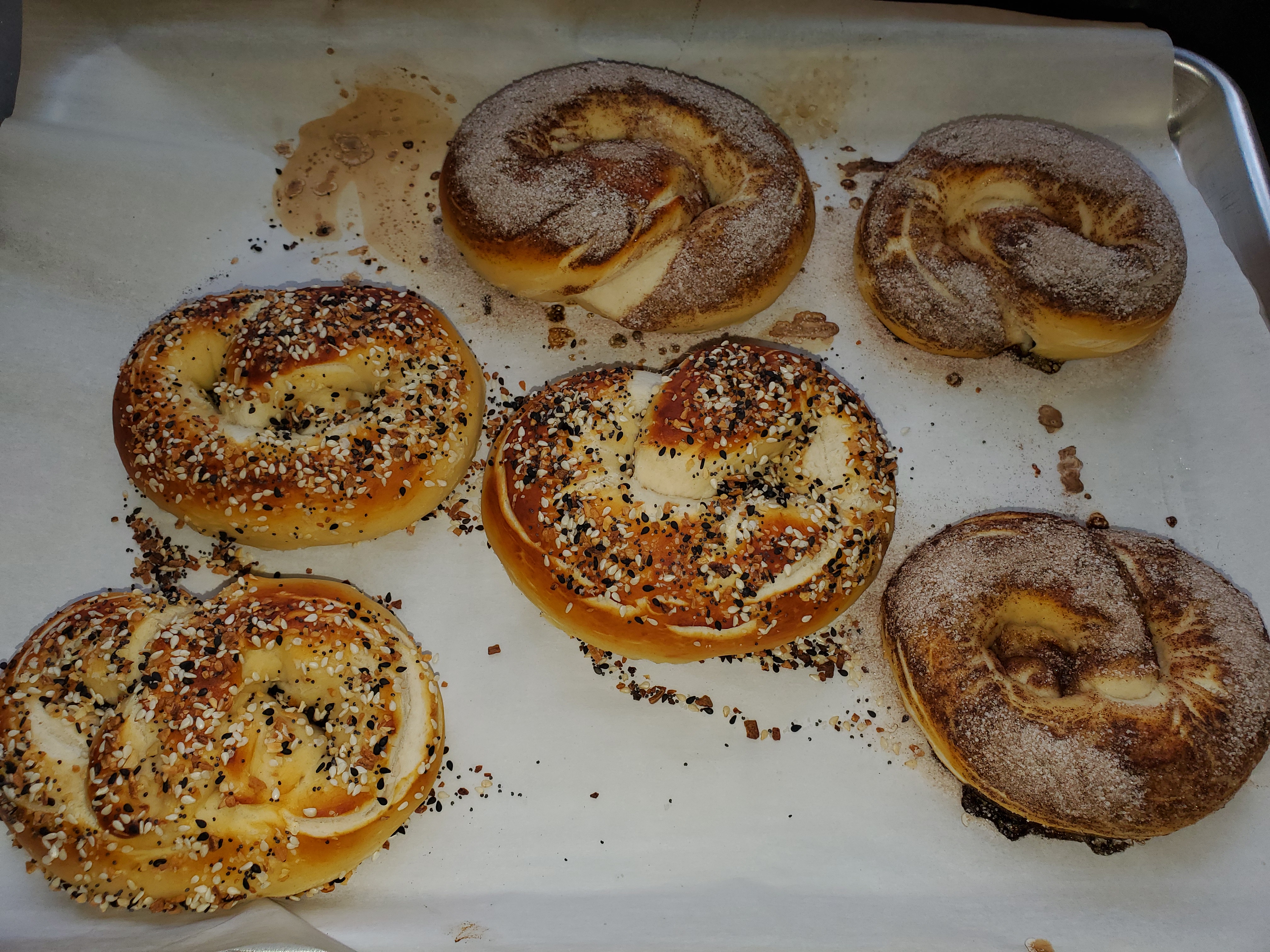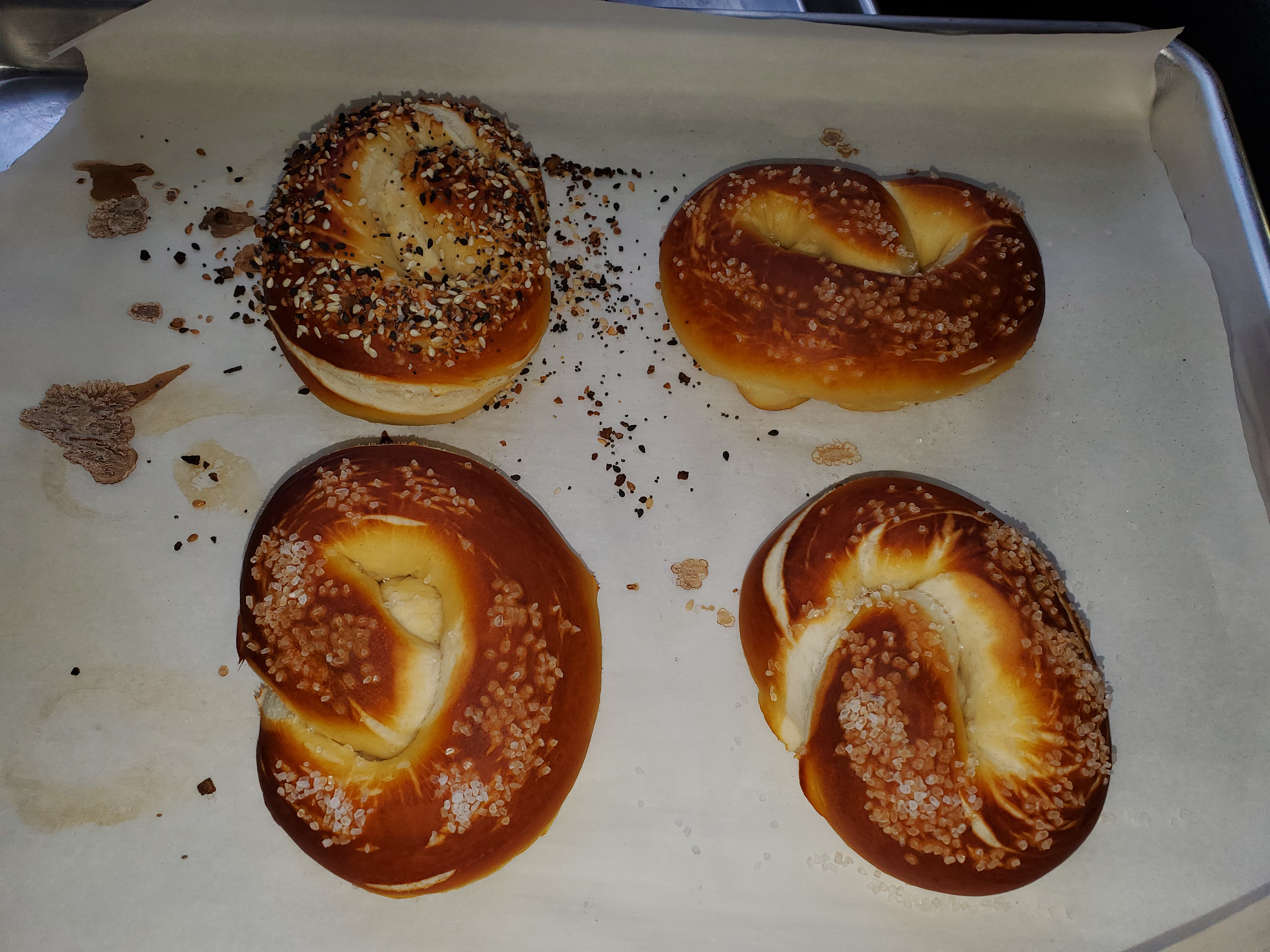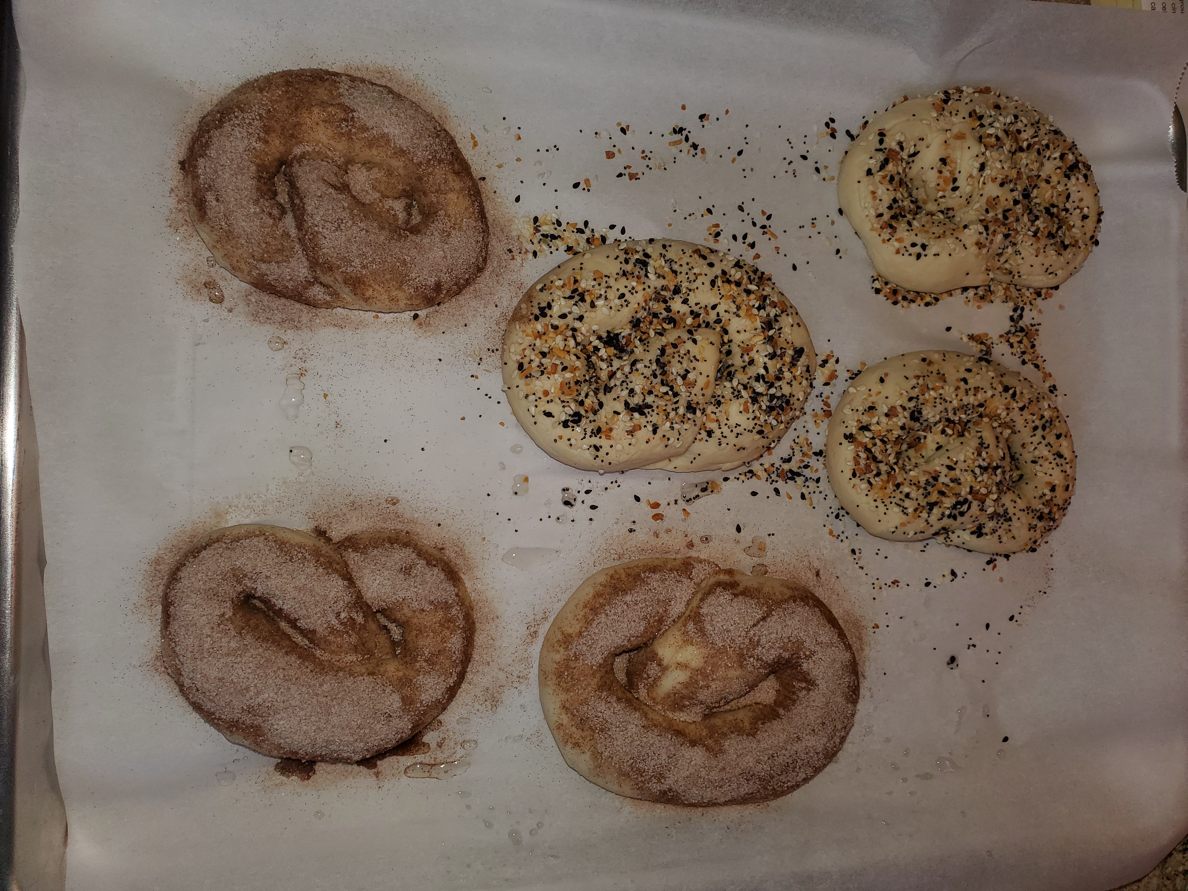 Place the pretzels on a baking sheet about an inch apart. The pretzels will be slightly sticky, which is the perfect time to add toppings. We used three different toppings, Everything Seasoning, Sea Salt, and Cinnamon Sugar. Simply sprinkle the selected topping over the pretzel. I pressed the topping down into the pretzel, just to make sure it stayed in place. I don’t recommend putting all three toppings on the same pretzel.