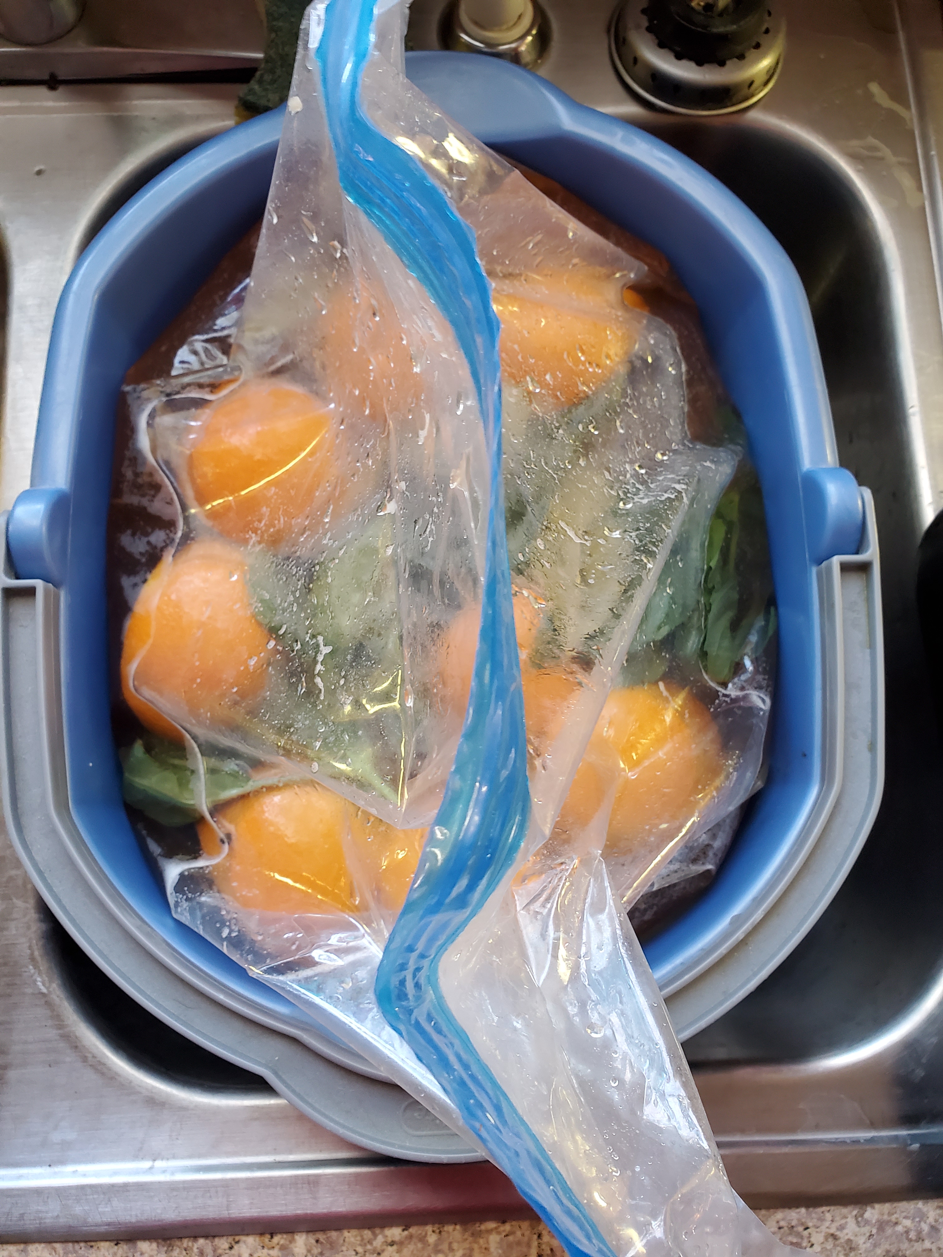 When the mixture has cooled, pour the mixture into the brining bag. The, empty six 12-ounce bottles of your choice of Indian Pale Ales into the brining bag. I liked the Sweetwater 420 IPA, which is a mildly hoppy IPA with good flavor. Add enough water to completely cover the turkey (8 – 12 cups). Placing the bag in a bucket helps keeps the bag upright and forces the liquids up toward the top of the bag. It also helps make the bag manageable. Cut the oranges into quarters and add to the bag. Add basil, rosemary, and thyme to the brining bag. Seal the bag and refrigerate. You will need to keep the turkey and brine under 45 degrees until you are ready to cook the turkey (at least 24 hours but not more than 48 hours).