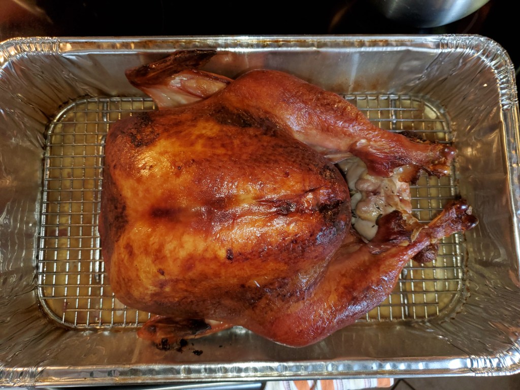 The timing of cooking the turkey is really based on the size of the turkey. I like to use the Butterball Turkey website for guidance on the timings. They have a calculator that allows you to select your turkey size and provides approximate times for thawing and cooking. My turkey was a little over 15 pounds, which meant it should cook for 3 – 3 ½ hours. While the turkey is cooking, you will want to brush the turkey with melted butter once every 30 – 45 minutes. Also, make sure that the water level doesn’t dry out completely.