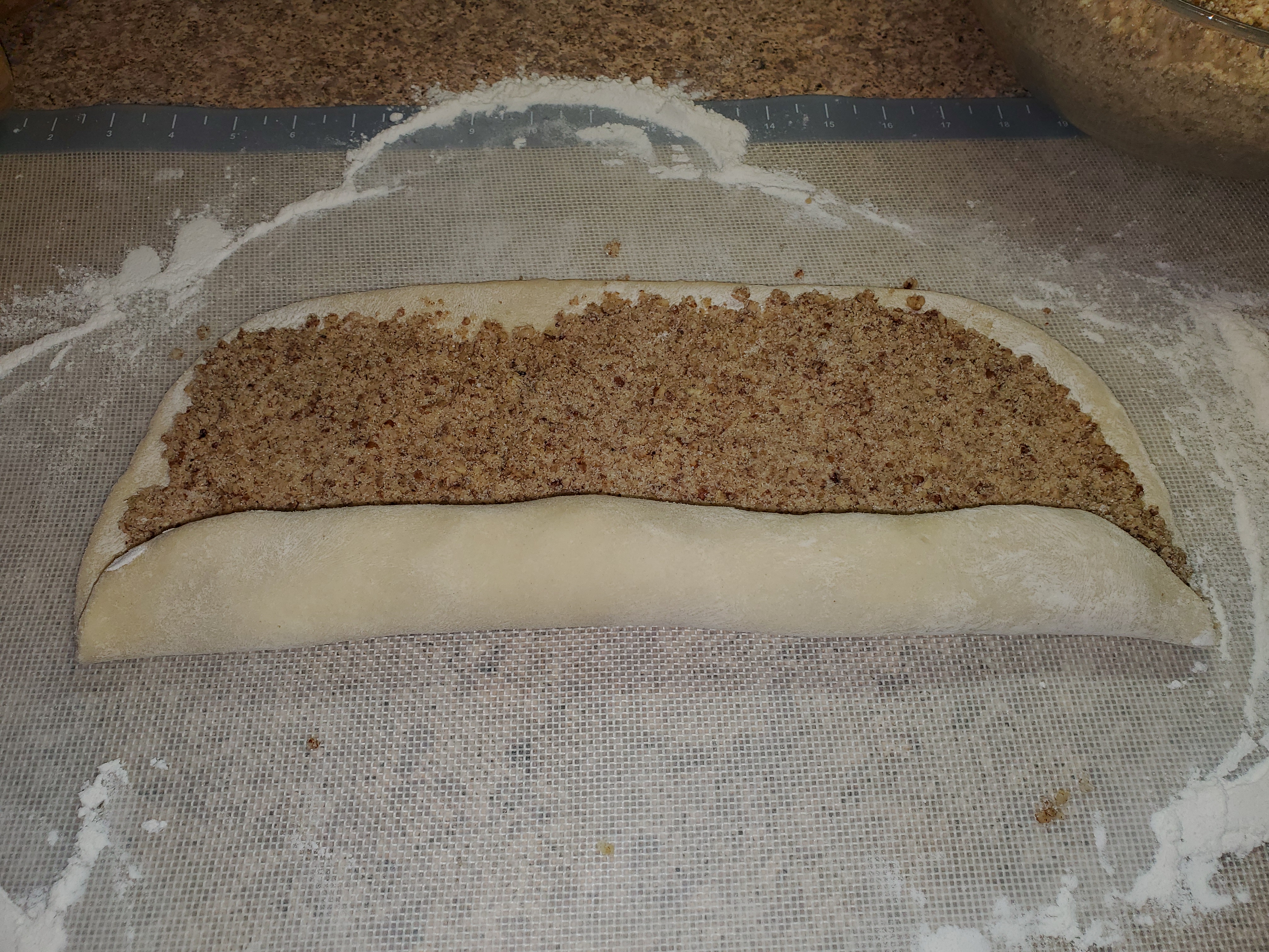 After the second raise, divide the dough into 4 equal parts. Roll out the one portion of dough into a shape roughly like a rectangle and about ¼ inch thick. Take your nut mixture and place about 1 cup of the mixture into the middle of the rectangle. Spread the nuts into an even layer of about ¼ inch thick. Add more nuts as needed. Press the nuts down lightly with your hand. Leave about ¼ to ½ inch from the edge of the dough clear of nuts.
