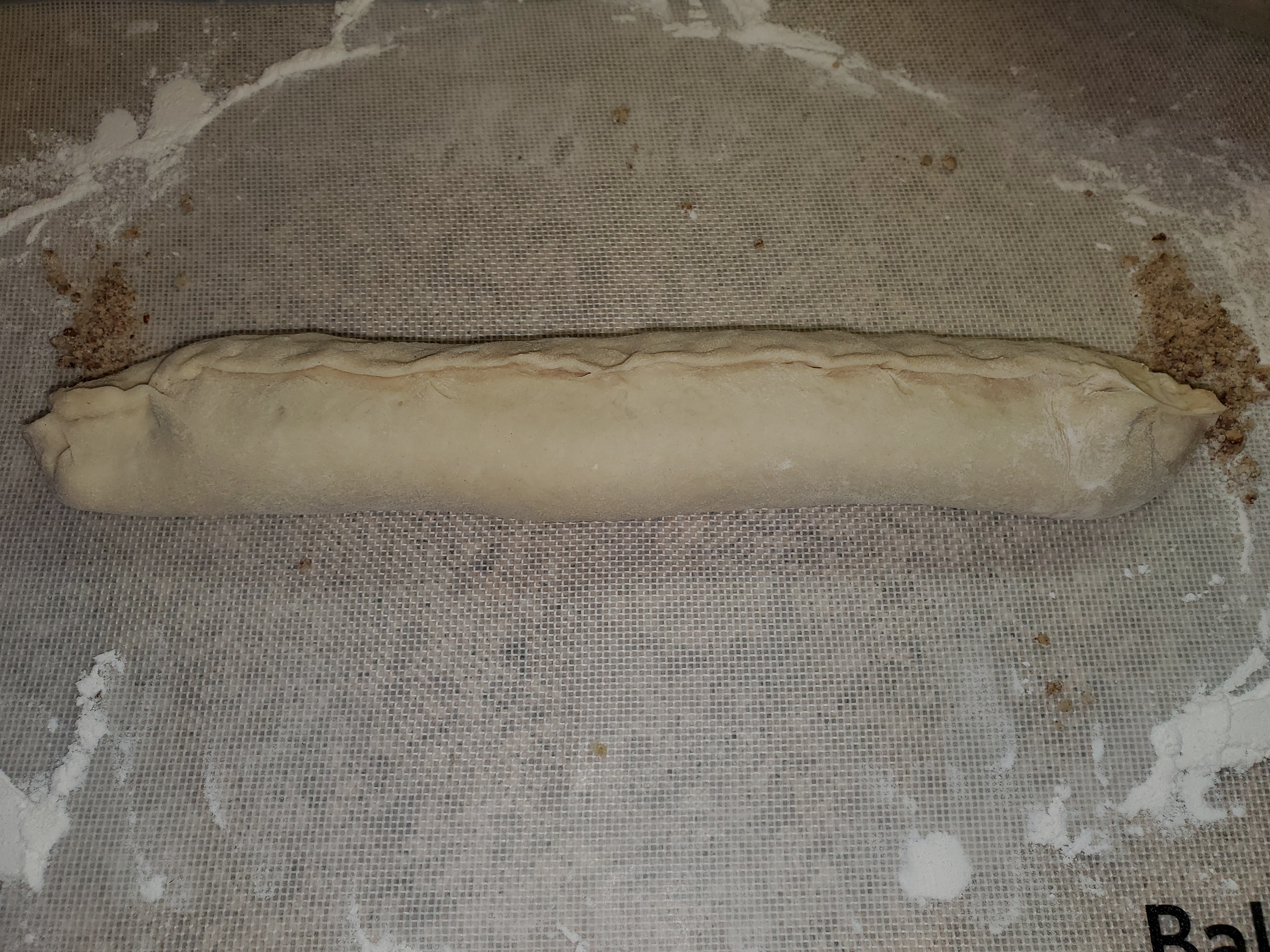 Once the nuts have been spread evenly and pressed down, it’s time to roll the dough. Along the long edge, lift the edge and fold it over, about ½ inch. Then using both hands slowly roll the dough all the way to the other edge. Take the open edge and pinch the dough closed along the seam. Make sure the seam is pinched together completely. For the ends, pinch the ends together, until the ends are completely closed. It’s hard to describe the process, so I have included pictures. Repeat this for each of the remaining pieces of dough.