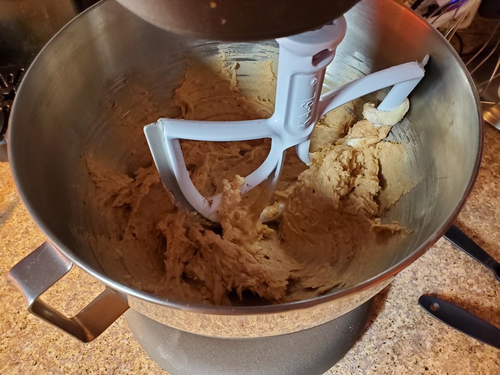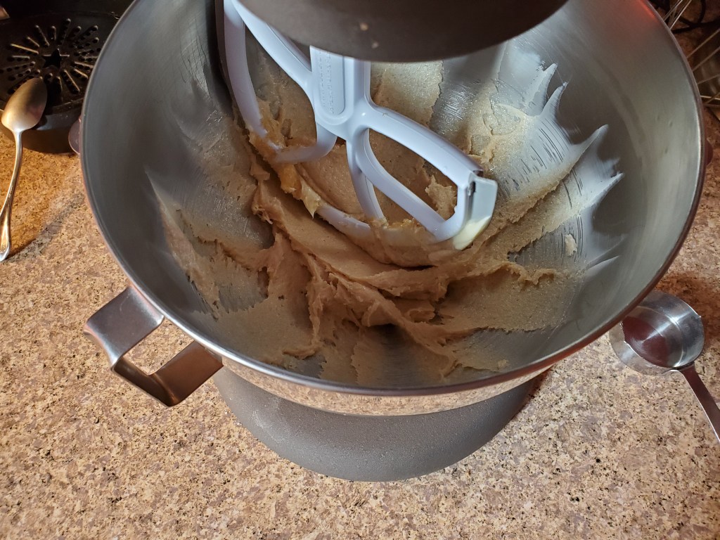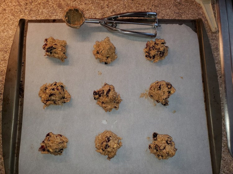 The recipe makes about 24 cookies, depending on how you measure out the dough. I used a 1 tablespoon scoop with a release trigger. I put nine cookies to a cookie sheet, so you should line 3 cookie sheets with parchment paper. Scoop the dough, 1 tablespoon at a time, onto the lined pan, spacing about 2 inches apart. Bake at 325 degrees Fahrenheit for between 10 and 15 minutes. The cookie should be slightly browned at the edges, yet soft to the touch on the top. After removing from the oven, let cookie remain on the cookie sheet for about 5 minutes, then move to a cooling rack.