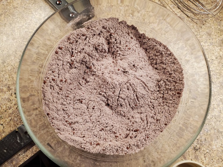 Next, in a bowl, whisk together 1 ¾ cups of flour, ¼ teaspoon of baking soda, 1/3 cup of unsweetened cocoa. Whisk until the dry ingredients are evenly brown. With the baking soda as a leavening agent, you will want to make sure it’s evenly distributed throughout, which is the whole purpose of whisking.