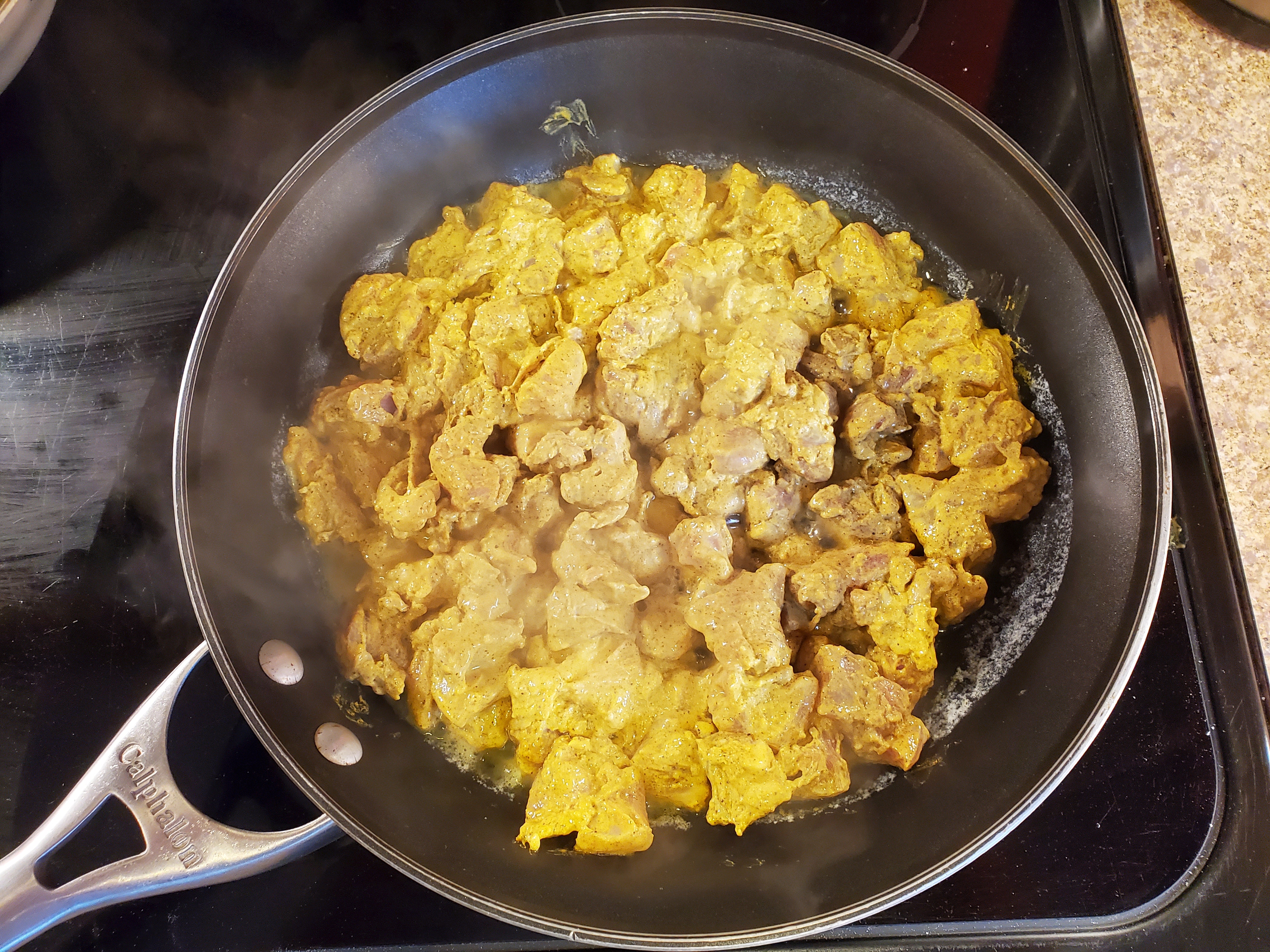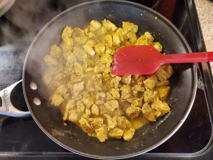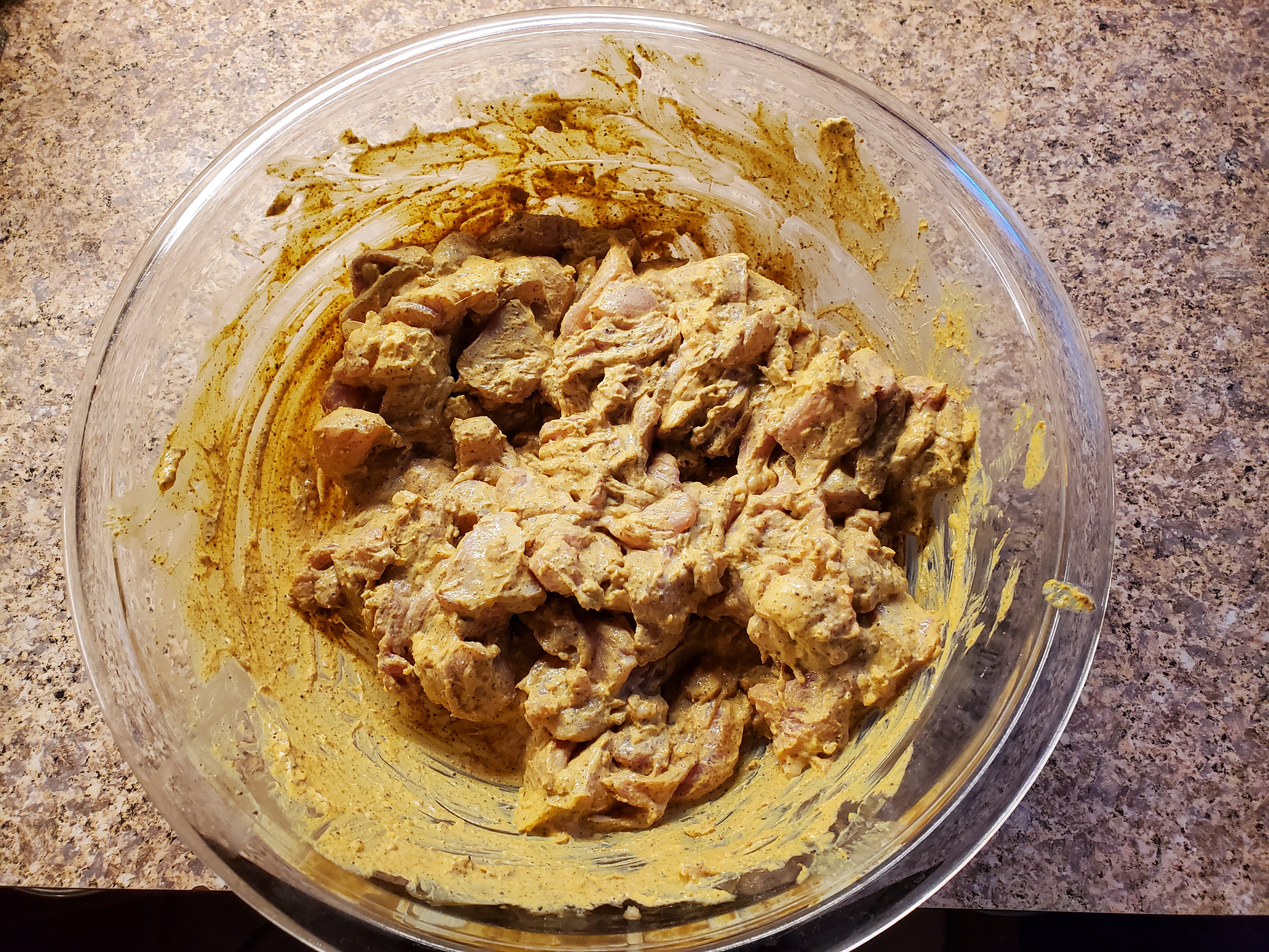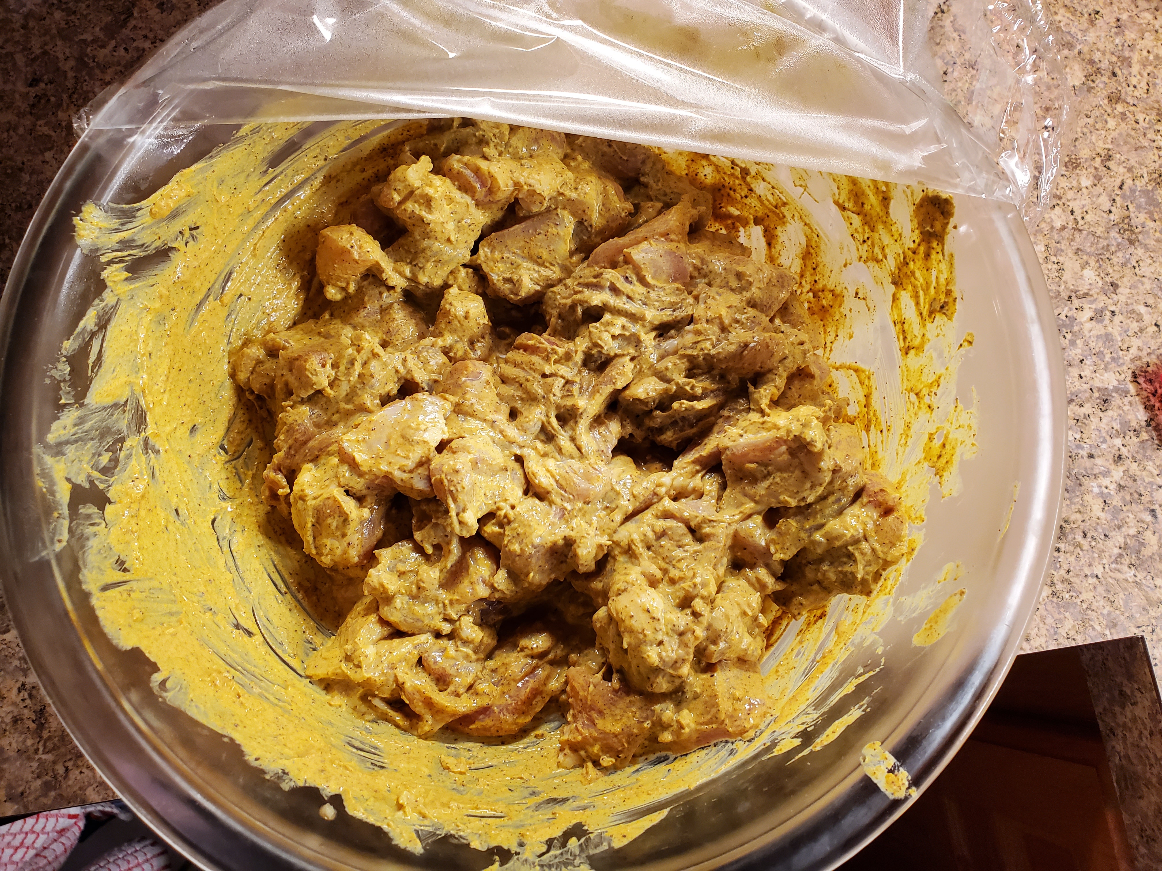 After cubing the chicken, make the marinade. Mix together ½ cup of plain yogurt (not Greek or Low Fat Yogurt), 1 tsp ground cumin, 1 tsp turmeric powder, 1 tbsp ground ginger, 2 tsp garam masala, ½ tsp chili powder, 1 tbsp lemon juice, 2 cloves of minced garlic. Mix until ingredients are evenly mixed. Once mixed, add the cubed chicken and coat the chicken thoroughly. Cover the bowl with plastic wrap and refrigerate for 3 – 24 hours. The longer the chicken marinates, the more the spices penetrate the chicken. I don’t recommend letting the chicken marinate for too much more than 24 hours.