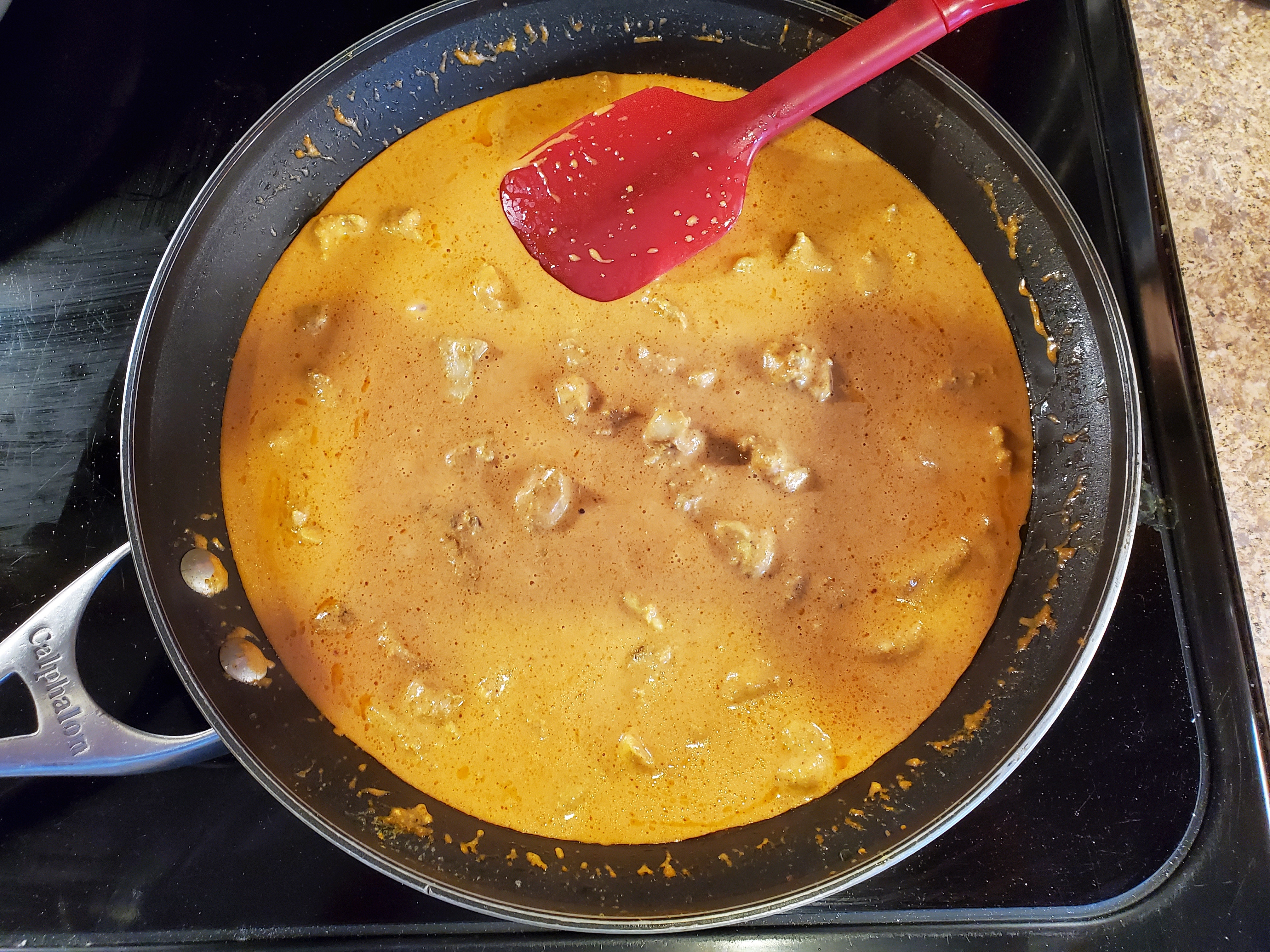 Reduce heat to low (a simmer). Cook for 20 – 25 minutes. Stir every 3 – 5 minutes, scraping the sides of the pan. As the chicken simmers, it will become a slightly deeper color. After 20 – 25 minutes, remove from heat and serve over rice.